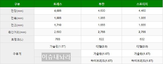 | 구분 | 토레스 | 투싼 | 스포티지 |