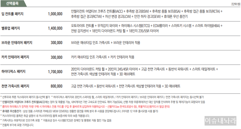 | 밸류업 패키지 | 1,400,000 | 오토라이트 컨트롤 + 우적감지 와이퍼 + 하이패스 시스템(ETCS) + ECM룸미러 + 스마트키 시스템 + 스마트 하이빔(HBA) + 전방 감지센서 + 18인치 다이아몬드 커팅 휠 + 18인치 235/55R 타이어 |