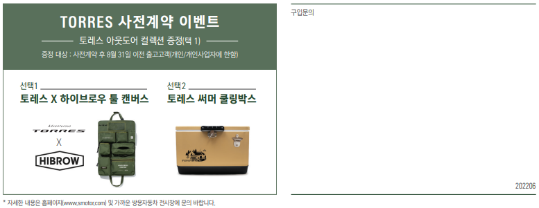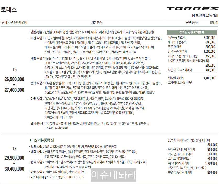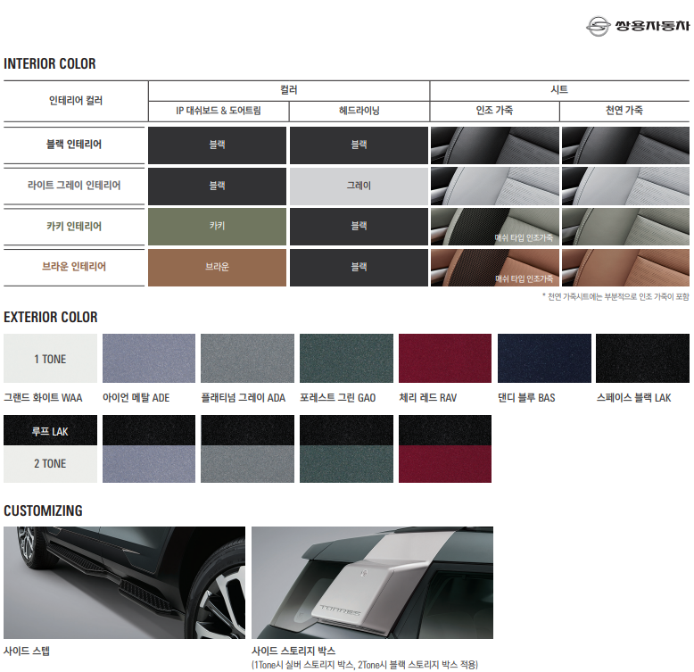 전트림 공통 선택품목 -4륜구동 시스템 2,000,000 -선루프 500,000 -무릎 에어백 200,000 -딥 컨트롤 패키지 1,000,000 -사이드 스텝(커스터마이징) 450,000 -사이드 스토리지 박스(커스터마이징) 300,000 -투톤 루프 익스테리어 400,000 •밸류업 패키지 1,400,000 •그레이시트 색상 변경 |