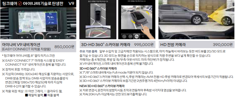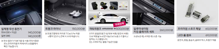 ▶ 파노라마 선루프 1,080,000 ▶ 라이팅 패키지 980,000 ▶ 센스 패키지 690,000 ▶ EASY CONNECT 패키지Ⅰ 1,130,000 ▶ 드라이빙 어시스트 패키지Ⅲ 830,000 |