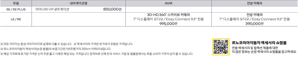 ※ 선택품목은 인하세액 반영한 가격으로 표기하였으며, 면세 가격은 표기에서 제외하였습니다.