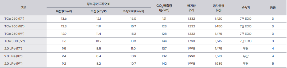 ※ 위 연비는 표준모드에 의한 연비로서 도로상태 · 운전방법 · 차량적재 · 정비상태 및 외기온도 등에 따라 실주행 연비와 차이가 있습니다.