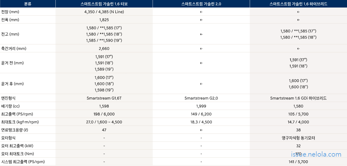 스마트스트림 가솔린 1.6터보, 스마트스트림 가솔린 2.0 모델은 N Line 전용 19인치 알로이 휠 적용,