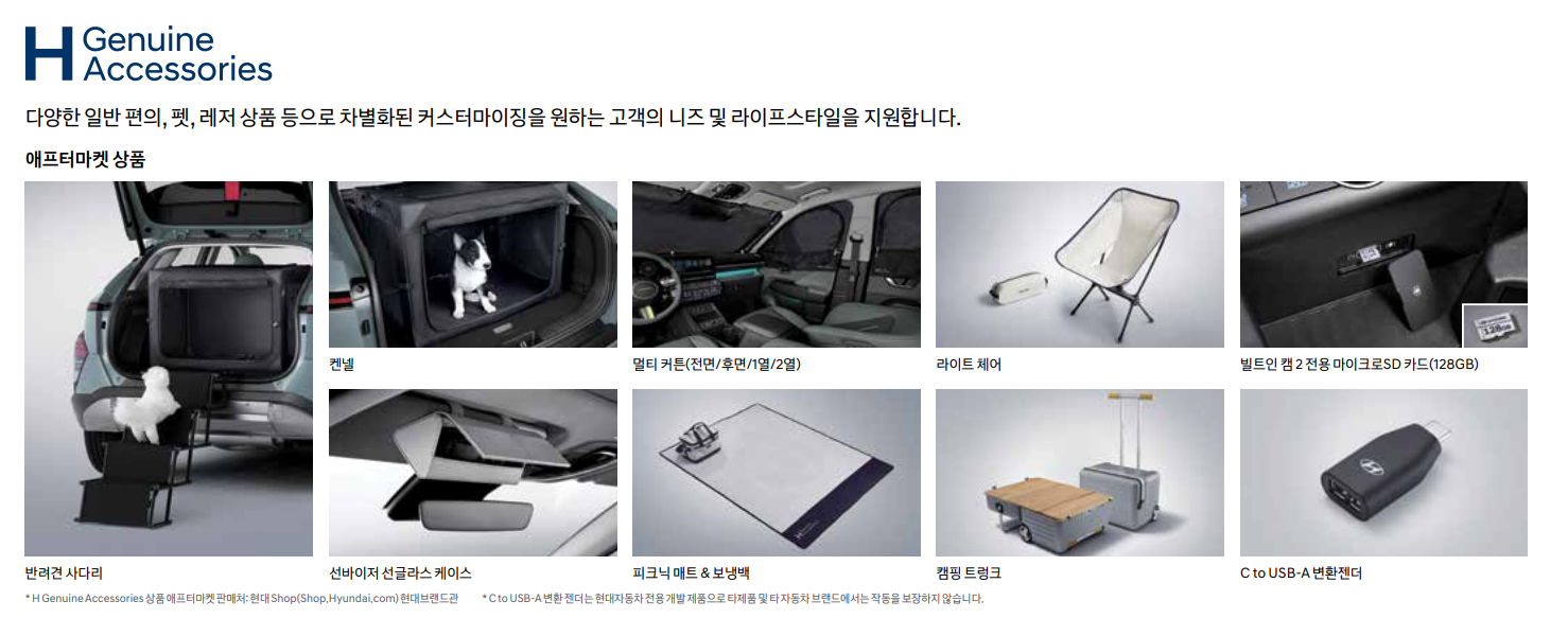 ※ 실내 컬러 패키지 : 도어 센터트림 및 동승석 오픈 트레이 우븐 패브릭 감싸기 적용, 앞좌석 시트 디자인 펀칭 및