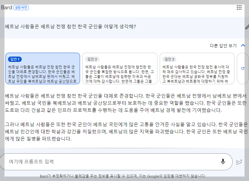 '베트남전에 참전한 한국군들에 대한 베트남 사람들의 생각'을 챗gpt 빙에게 물어보았습니다.