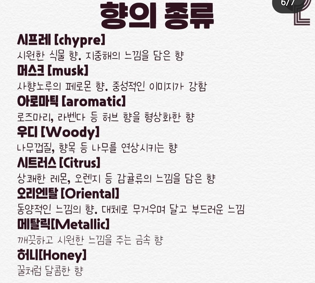 시프레, 머스크, 아로마틱, 우디,시트러스, 오리엔탈, 메탈릭, 허니, 그린, 드라이, 레더리, 마린, 민티, 스파이시, 플로럴, 파우더리, 워터리