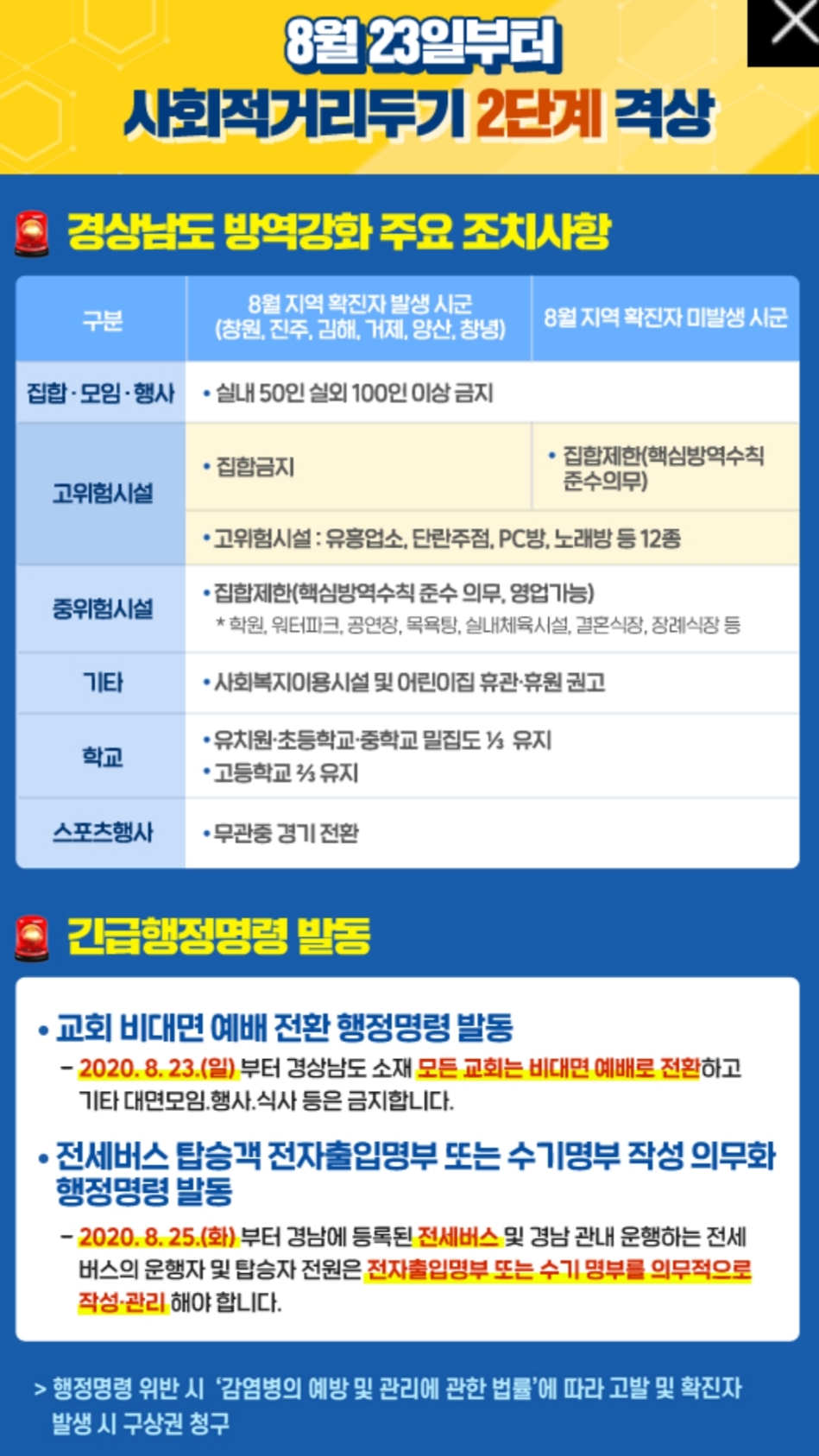 경상남도 방역강화 주요 조치 사항 및 긴급 행정 명령 발동 내용은 아래를 참고하시기 바랍니다.