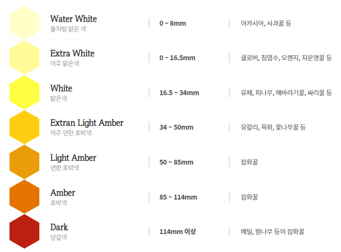 벌꿀등급표 Colour Grade(m/m)by Pfund Scale